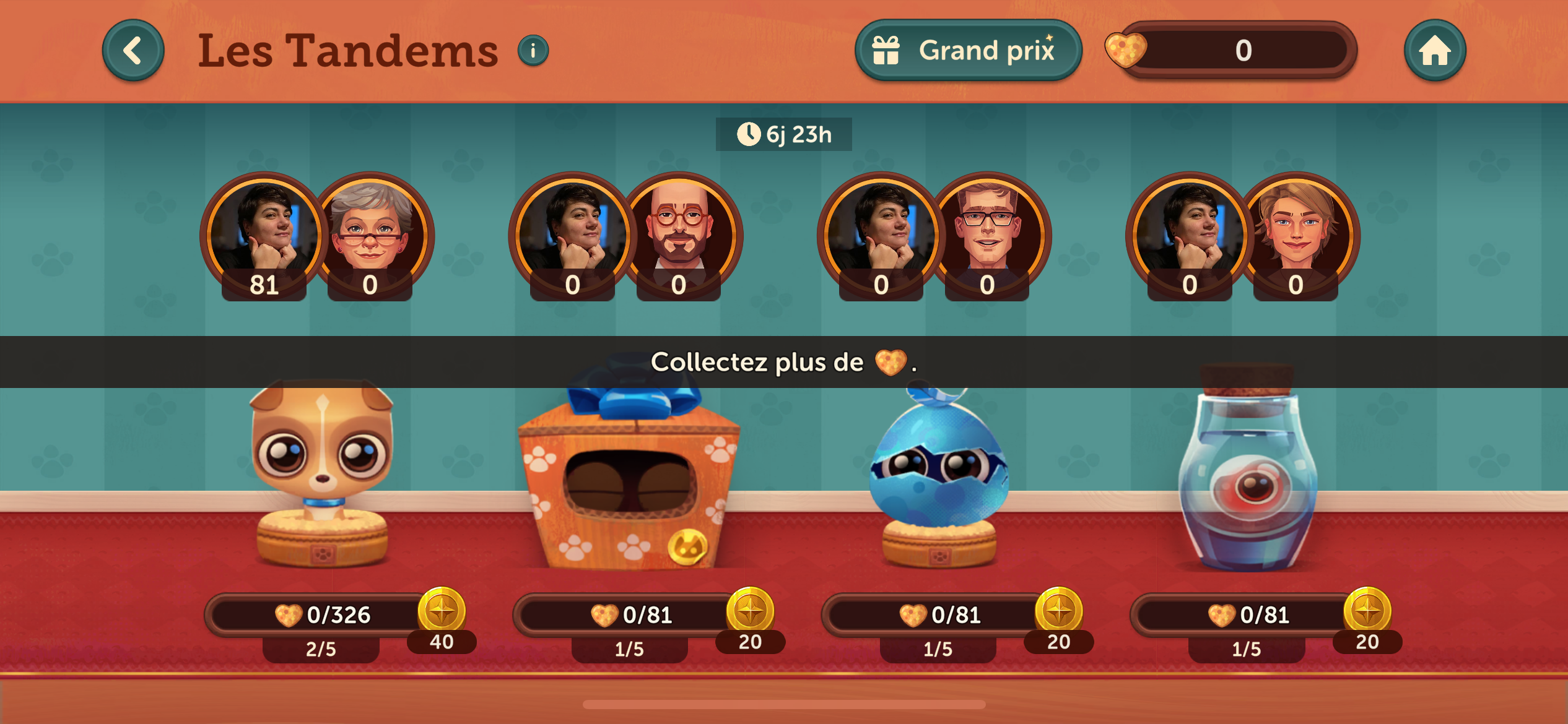 Une fois votre stock approvisionné, rendez-vous sur l'onglet des Tandems, appuyez sur l'animal que vous voulez nourrir et maintenez appuyé (plus vous appuyez longtemps, plus l'animal choisi mange). Et si vous n'avez plus de nourriture disponible, un message vous rappelle de jouer de nouvelles parties pour en collecter et continuer à nourrir vos animaux !